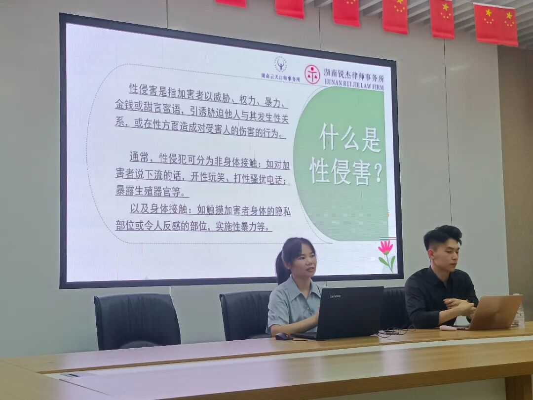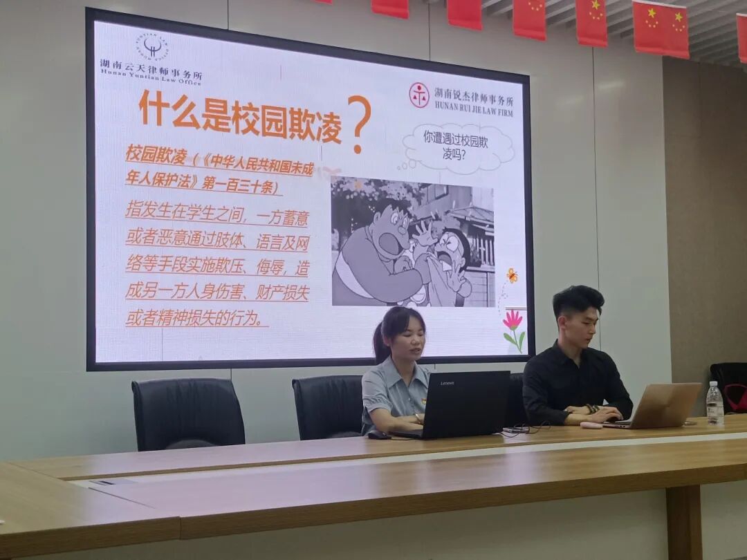 锐杰动态||湖南锐杰律师事务所联合金瑞社区成功举办预防校园霸凌专题讲座发表时间:2025-02-17 14:49 为进一步增强学生的法制观念和法律意识,有效预防和减少校园霸凌及性侵事件的发生,提高青少年的防范意识和自我保护能力,近日,湖南锐杰律师事务所联合长沙市望城区金瑞社区党群活动中心,共同举办了“法伴成长,青春无悔”校园霸凌预防讲座。此次活动吸引了众多青少年学生的积极参与。 随着暑假的脚步渐近,第一中学的师生们迎来了一年一度的志愿服务季。今年,学校决定组织一支志愿者队前往幸福村,开展普通话推广教学活动,并助力当地乡村振兴。 ![]() 活动中,我所范智辉律师结合法律实践经验,从法律、心理和社会等多个角度深入剖析了校园霸凌的成因、危害及预防措施,并通过一系列触目惊心的案例,让同学们直观地感受到校园霸凌对受害者造成的深远影响,充分认识到预防和干预校园霸凌的重要性。